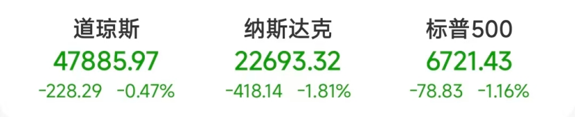 截至当日收盘,道指跌228.29点,跌幅为0.47%,报47885.97点;纳指跌418.14点,跌幅为1.81%,报22693.32点;标普500指数跌78.83点,跌幅为1.16%,报6721.43点。