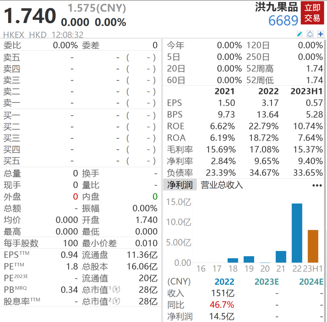 截至停牌前,洪九果品股价已跌至1.74港元,总市值仅剩27.95亿港元,较巅峰蒸发超95%。