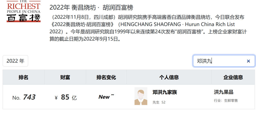 据胡润百富榜,2022年,邓洪九曾经以85亿元身家登上胡润百富榜。