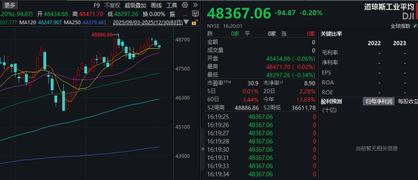 当地时间12月30日(周二),美国股市三大股指小幅收跌,其中道琼斯工业指数跌0.2%,报48367.06点;标准普尔500指数跌0.14%,报6896.24点;纳斯达克指数跌0.24%,报23419.08点。值得注意的是,上述三大股指均录得三连跌。