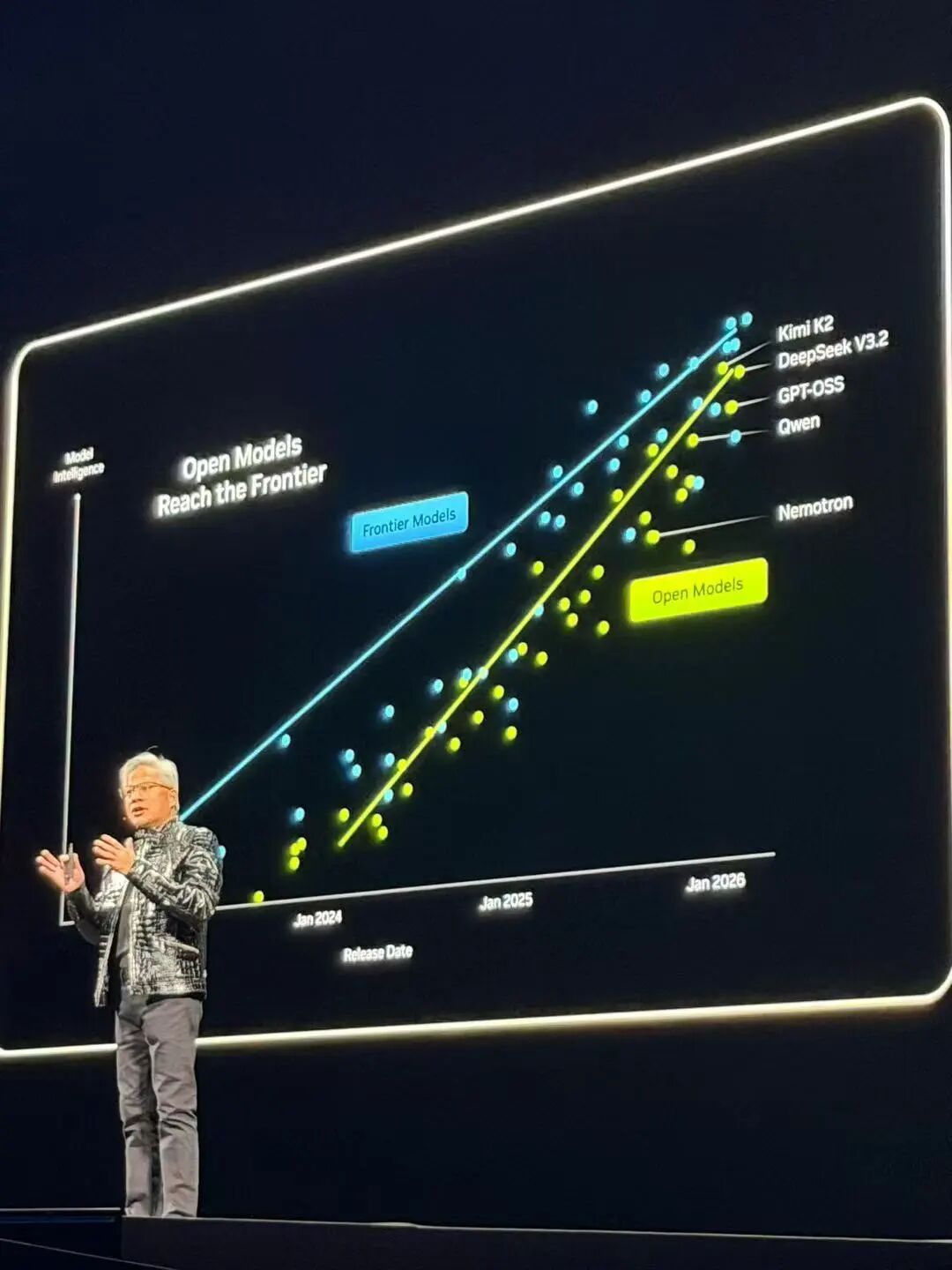 当地时间1月5日,在拉斯维加斯的英伟达发布会上,身穿皮衣的英伟达CEO黄仁勋总结了AI行业去年的进展,称开源模型的崛起成为全球创新的催化剂,其中Deepseek R1的出现意外推动了整个行业的变革。目前全球涌现出多个开源模型,他们的性能越来越逼近领先的前沿大模型。他身后图片中展示了多个开源模型,包括三家中国开源模型,分别是Kimi K2、Qwen、DeepseekV3.2。