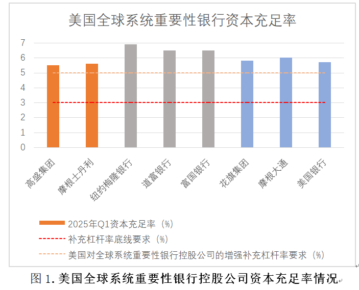 杠杆率监管是2008年金融危机后美联储引入的最重要的银行资本监管规则变化之一,其设定主要基于在安全与效率间的权衡,设置较高的底线将增厚机构资本实力,但影响信贷派生能力。美联储在引入杠杆率监管的同时,还要求银行将美国国债等“无风险资产”与高风险资产同等对待,由于美国银行体系持有大量美国国债,国债的纳入对相关机构杠杆率指标影响较大(对于大型银行,在目前约5%的水平上导致约1个百分点的浮动),当前美国8家GSIB的杠杆率均保持在5%以上(图1),显著高于欧洲、加拿大和日本的大型银行。